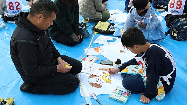 参加者は受付時に受け取ったたこの材料を使って早速たこ作りの開始です。子ども達は好きなキャラクターや怪獣、電車、今年の干支(えと)にちなんだ馬のイラストなどをカラーペンで自由に描き、竹ひごの骨組み取り付けや、バランスを取るため尻尾づくりなどの難しい工程は一緒に参加した両親や祖父母らが協力しながら、それぞれの個性が詰まったたこを作りあげました。
