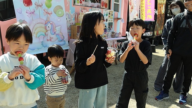 炭火焼きやクレープ、ワッフル、燻製などを販売するキッチンカーもお目見えし、フェスタを盛り上げました。