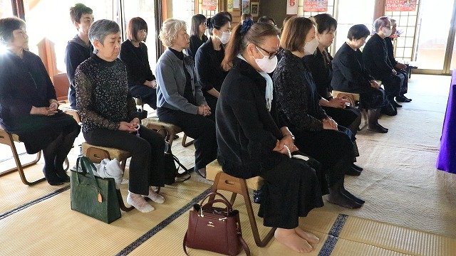 法要後は、本堂の入り口横にある花塚前に移動し、野中住職の読経が響く中、参列者一人一人がラナンキュラスやガーベラ、スターチスといった色鮮やかな花を供えて水を掛け、手を合わせました。
