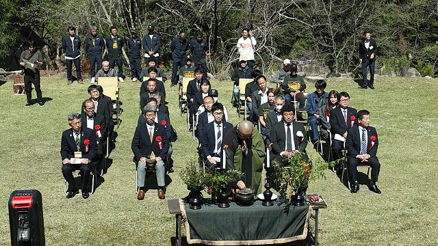 新緑の季節を迎え山々が様々な緑色で染まるなか、延岡市北方町上鹿川の鹿川キャンプ場で4月11日、キャンプ場開きが行われました。今シーズンから同町曽木にある建設会社「有限会社曽木観光開発」が新たな指定管理者に選定され、通年で営業することになったこともあり、法要や式典、祝賀会を通じて新たな門出を祝いました。